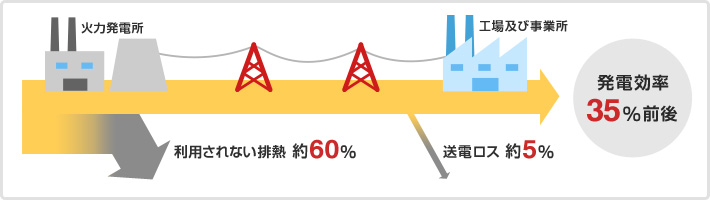 最大のメリットはエネルギーコストを削減できることです。本来捨てられてしまう排熱を回収し、冷暖房や給湯、蒸気などに利用することによって、工場や事業場での省エネルギー、CO2削減が図れます。エネルギー効率は利用状況により異なりますが、発電効率と排熱回収効率を合わせて70%~85%になります。(当社実績最大効率92%)